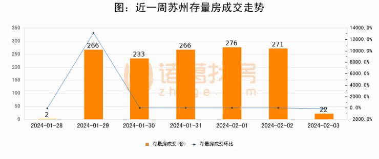 从存量房来看,2024年02月03日苏州存量房单日成交22套,比昨日减少249套,环比下降91.9%。从近一周存量房成交来看,苏州存量房日均成交套数为190套,02月03日单日成交22套,低于近一周平均水平88.4%。