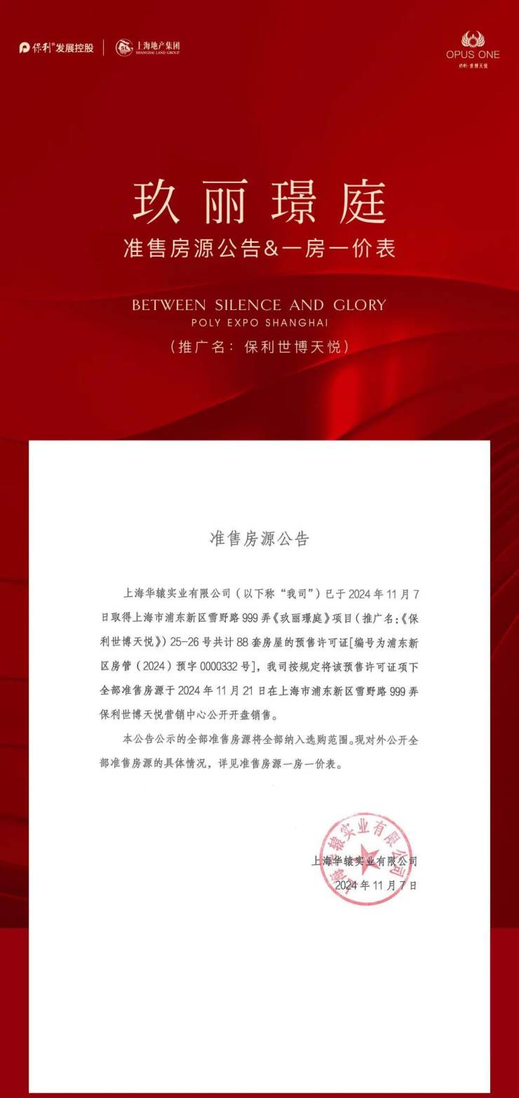 1、项目推广名为“保利·世博天悦”,地名核准名/备案名为“玖丽璟庭”,开发公司为:“上海华辕实业有限公司”;预售证号:浦东新区房管(2024)预字0000332号;2、本资料为要约邀请,不作为要约或承诺;3、相关宣传内容不排除因政府相关规划、规定及出卖人分期规划、未能控制等原因而发生变化;4、买卖双方的权利义务以双方签订的商品房买卖合同及其补充协议、附件等书面文件为准;5、本宣传材料所涉及户型仅供示意参考,具体以政府部门最终审定的图纸和销售合同为准,本资料所涉及面积皆为预估面积,相同户型单位因楼栋、楼层、单元等差异,局部结构、形式、面积、装饰等可能有所不同,且预估面积与实际面积可能存在差异,面积最终以房管局测绘为准。户型图中装修、家具、电器等设备仅为示意,不属于交付内容和交付标准,实际部品的选型和房间空间尺寸根据户型情况,略有差异,以现场实际为准;6、本宣传资料中涉及的价格、折扣、付款方式等信息,因销售时间、户型楼栋、楼层、方位等不同有所差异,以双方签订的商品房买卖合同及其补充协议、附件等书面文件为准;7、本资料所发布的内容为2024年11月的信息,敬请留意最新资料。
