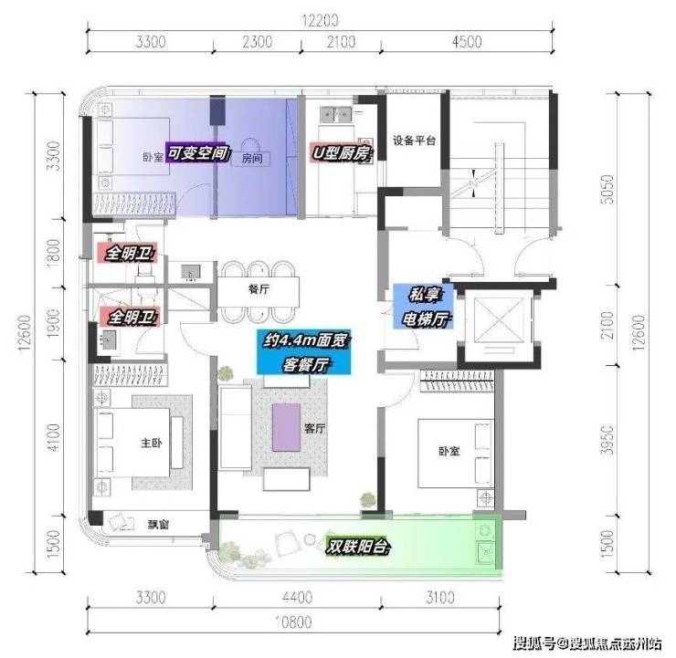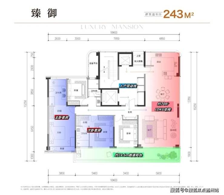 此外,双套房的设计适应多种家庭场景、北房间可以融入主卧、约14.6m的跑道阳台,都是不可多得的优势。