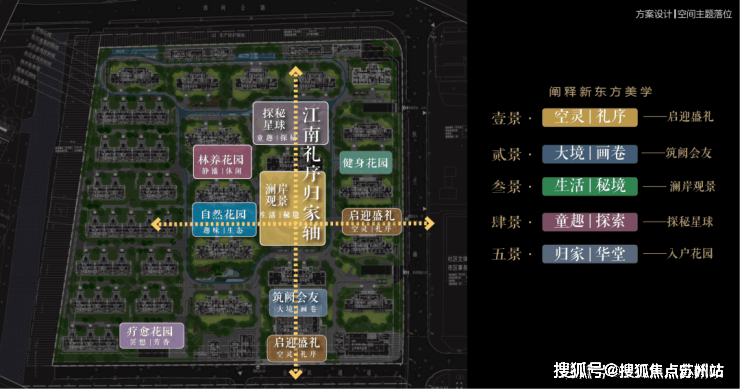 以江南人文精神为源点,打造两轴一环五进空间,江南礼序归家轴串联启迎盛礼、筑阙会友、归家华堂等5重礼制,尊崇归家;健康运动轴以24小时跑道为社区活力生活环,串联儿童乐园、长者康养、疗愈花园等10大生活场景,营造全龄全时的江南诗意生活