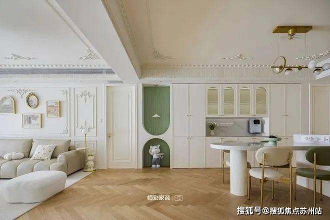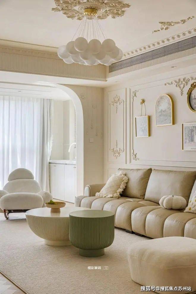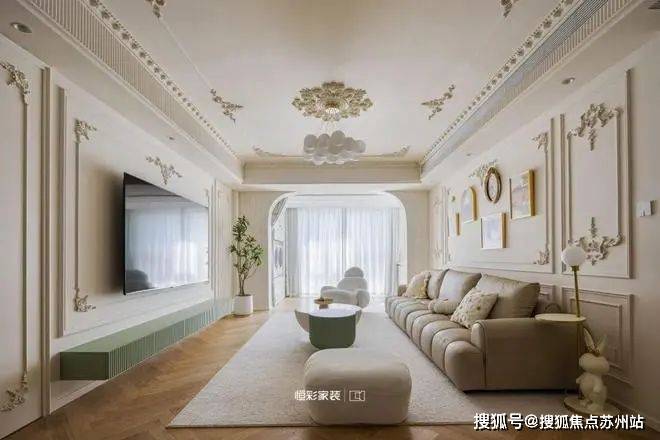 整个客厅淡奶油色为主,墙地面都是柔和的奶白色,拱形门洞搭配宫廷风角花更显温柔贵重,阳光正好时,透过纱帘点亮整个居家空间。