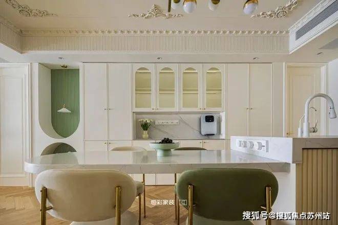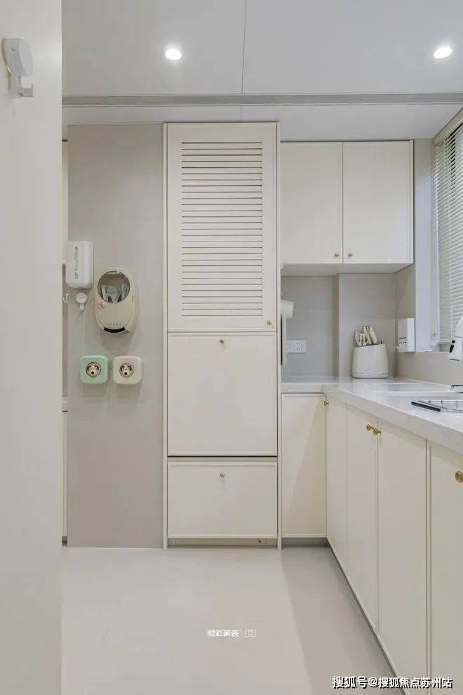 厨房地面与橱柜都选择温柔的奶油色,柜子定制了温柔的奶油色搭配金色把手,于细节之处升华空间格调,自然光下更显柔和,与橱柜错落布局显得空间宽敞明亮,台面充足,做饭的时候心情也美美哒。有烟火气的厨房,生活才能有滋有味。