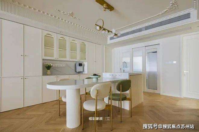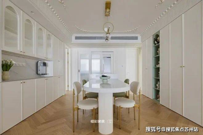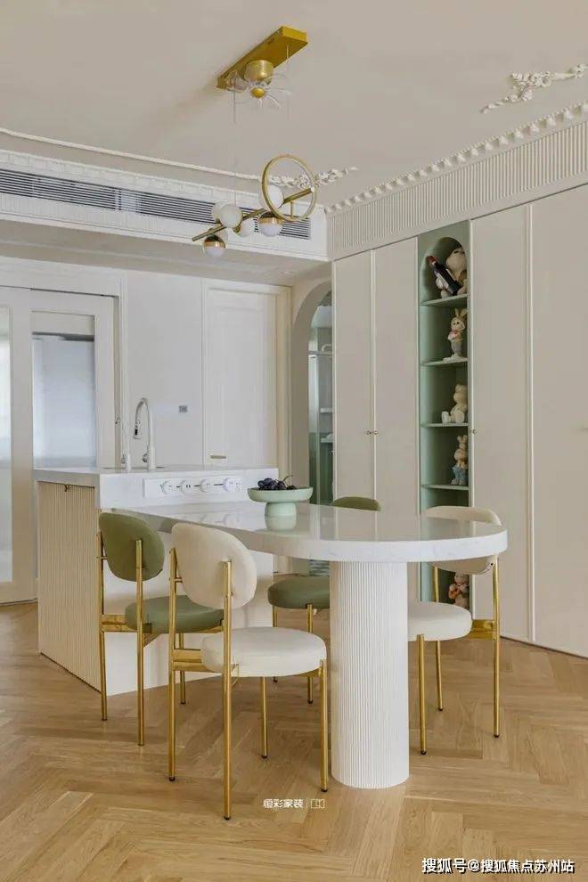 餐厅与厨房之间 定制半高岛台作为软隔断 ,吧台内部设计抽屉储物,颜值、实用兼得。带点轻奢感的餐桌椅与朦胧感的玻璃柜门搭配颜值超高,同系列的餐厅金属吊灯再次将美貌值拉高。