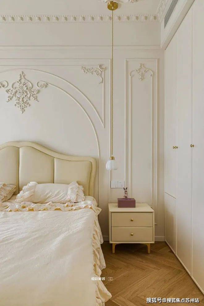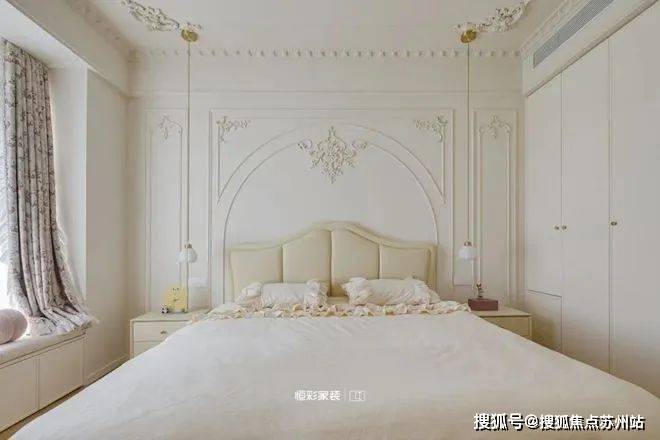 主卧同样没有过多的色彩碰撞,整体看起来明亮纯粹。背景墙以对称的奶白色石膏线搭配雕花装饰,优雅又贵气,客厅同款花瓣水晶灯超美。床头两盏对称金属南瓜吊灯垂下,让人不由得沉醉在这一片静谧之中。