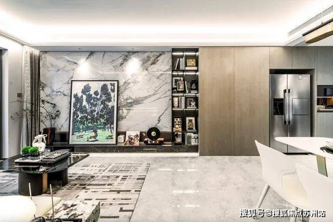 入户到客餐厅空间感拉强,客厅与餐厅呈大横厅格局,背景墙采用双弧形搭配格栅与灯光,设计出更加风格化的造型,让整个空间艺术感直接拉满。
