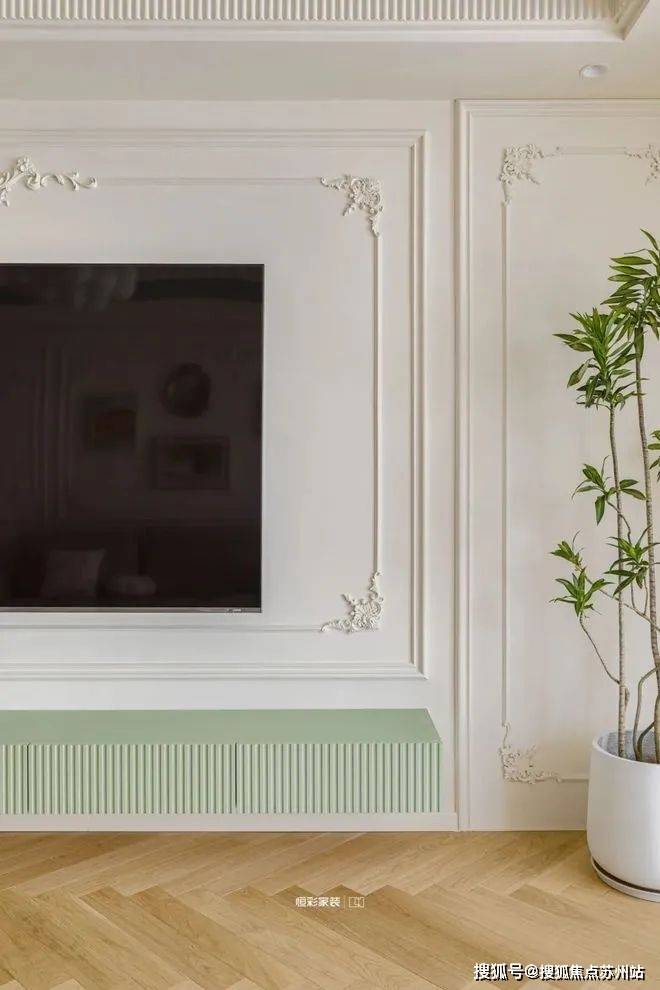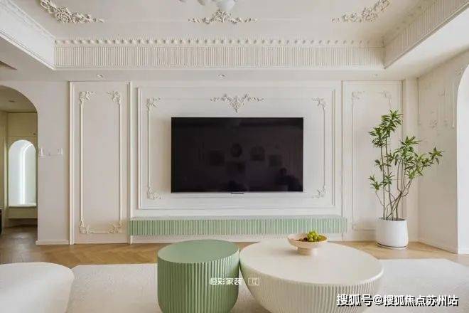 电视背景墙侧边以对称石膏线点缀,另一侧绿植的出镜更添几分生趣儿,传递出的格调,也是奶油风所独有的治愈系温柔。吊顶处以法式钢琴线与角花装饰,满是浓浓的法式奶油氛围感。