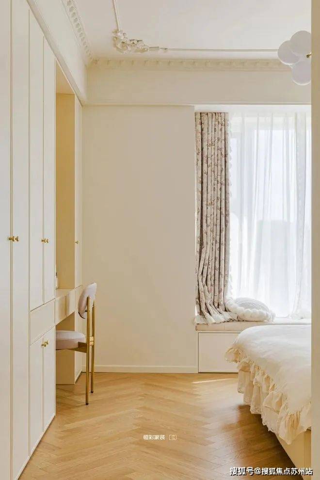 软装决定了一个房间甚至是主人的气质,奶油感满满的床品、法式复古的窗帘,每个角落都流露出温柔的浪漫风情。卧室地板鱼骨拼,这颜值不要太好看。