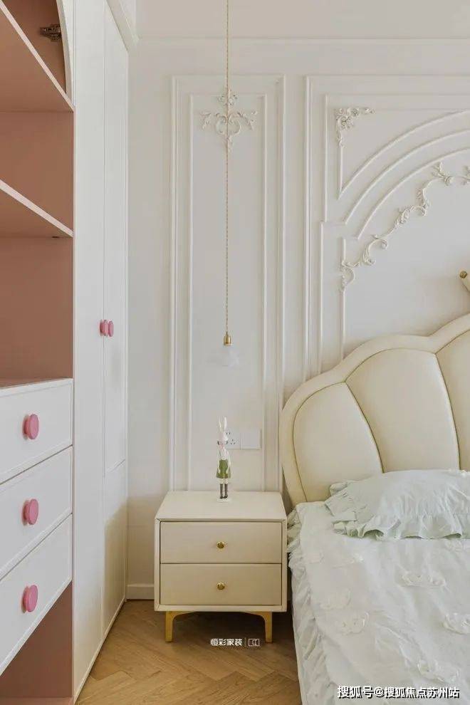 女儿房满足休息+娱乐+收纳功能,给孩子营造一个温馨舒适的活动空间,同款花瓣造型的主灯、南瓜吊灯,在细节中寻求法式的精美浪漫。