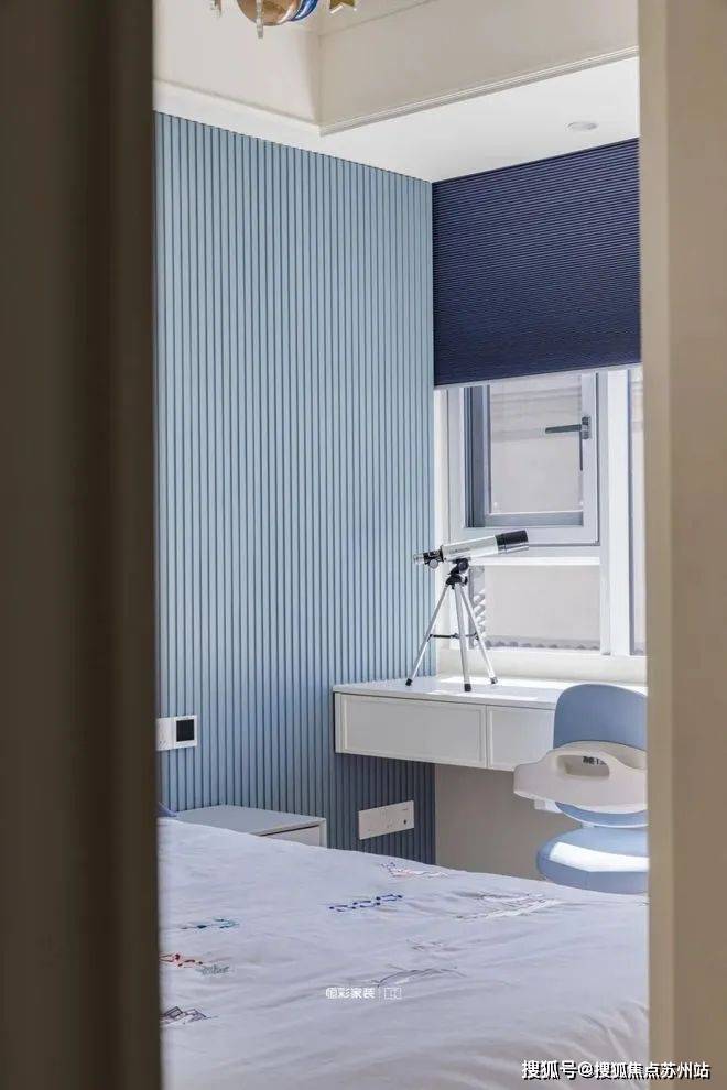 儿子房空间风格相对沉稳清新,家具软装多卡通造型,兼具舒适和实用性,配色自成一体,尊重孩子的喜好选择蓝白色系,仿佛与窗外的蓝天白云相融,有助于孩子在这个温馨的环境中专心学习和思考。