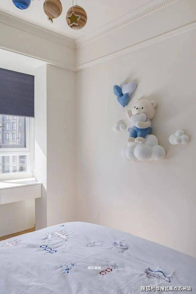 儿子房采光很棒,主要是满足休息+娱乐+收纳功能,星球吊灯十分吸睛,再搭配云朵小熊的墙壁挂件,给孩子营造一个童真童趣的活动空间。