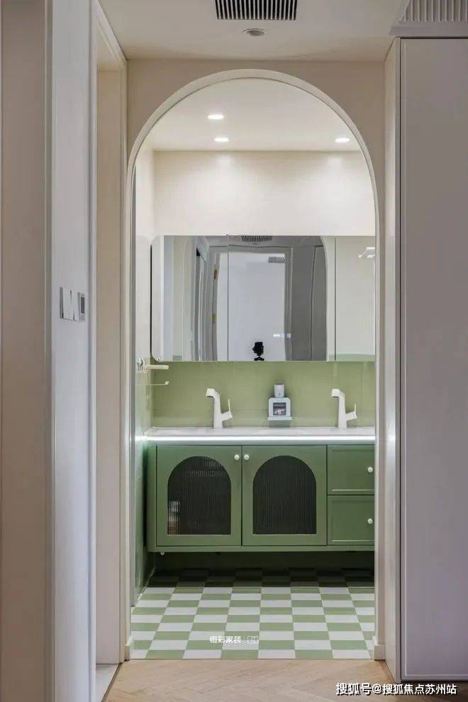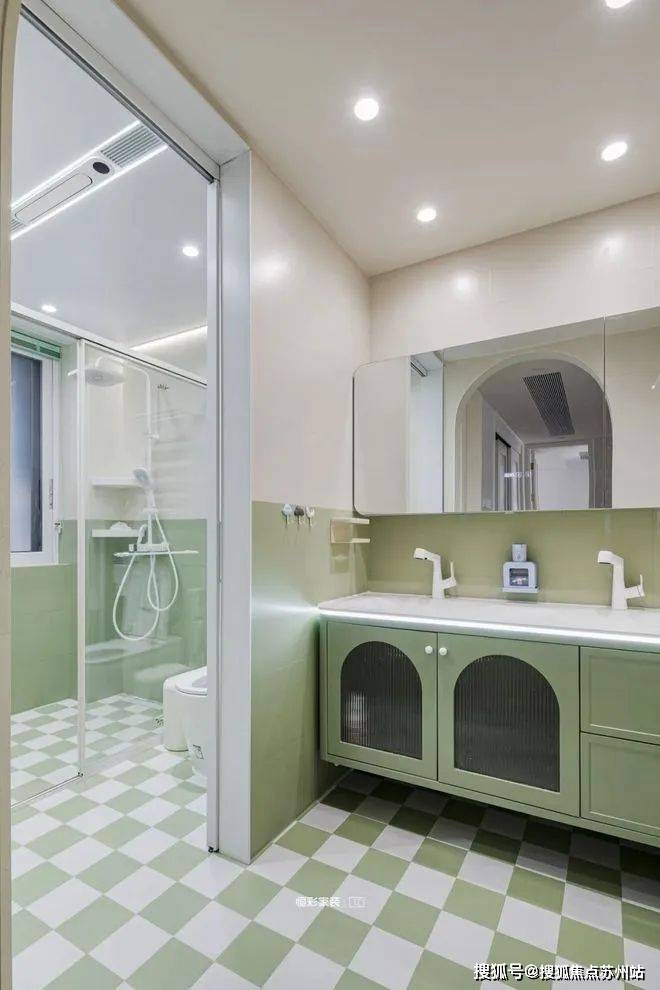 常见的灰色系瓷砖容易显得暗沉,墙砖地砖都选用了几何图案的小花砖,满满的奶油调调,一绿一白,整体灵动活泼,衬得格外清新舒畅,颜值超高。