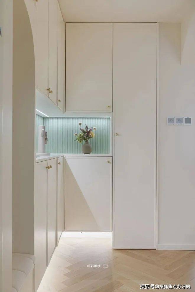 拱门造型的换鞋区多了圆润的弯角,看上去温柔又可爱,金色拉手柜门提升美观度。