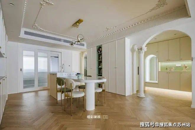 玄关步入客餐厅的门厅处,被这个法式拱门吸引,精致的拱形门+罗马柱带来特别的韵味与风情,再次强调整体空间的法式浪漫格调。