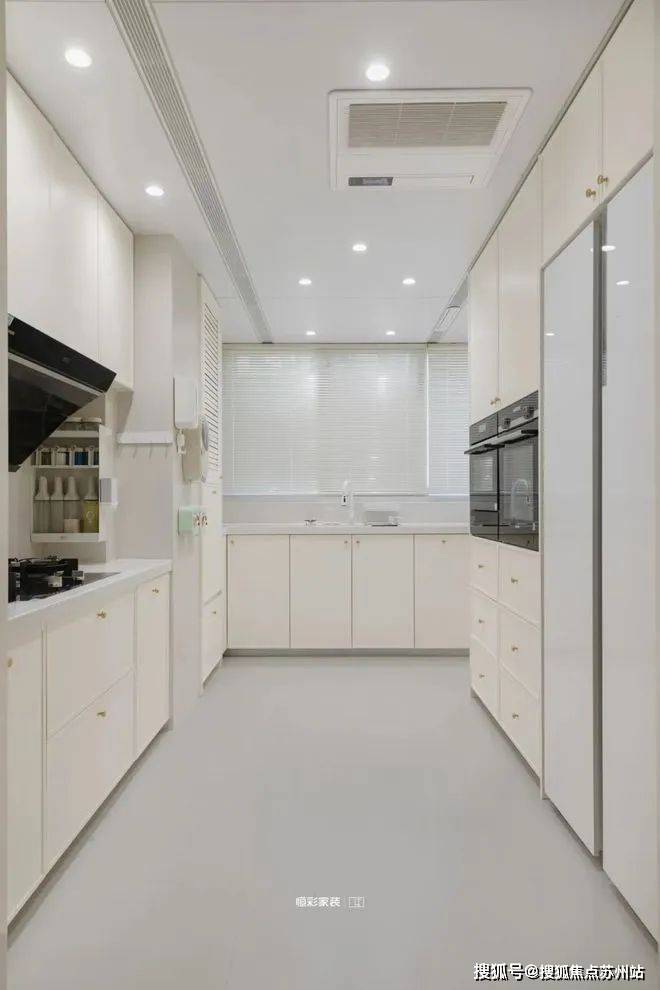 厨房自身条件不错,做了大U字型的台面设计。还巧妙利用边柜空间嵌入蒸烤箱、洗碗机及冰箱,活动空间也更充足。