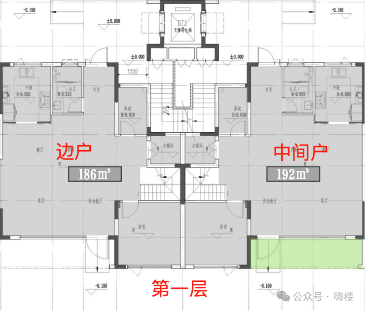边户约186㎡;中间户约192㎡(四房两厅三卫):