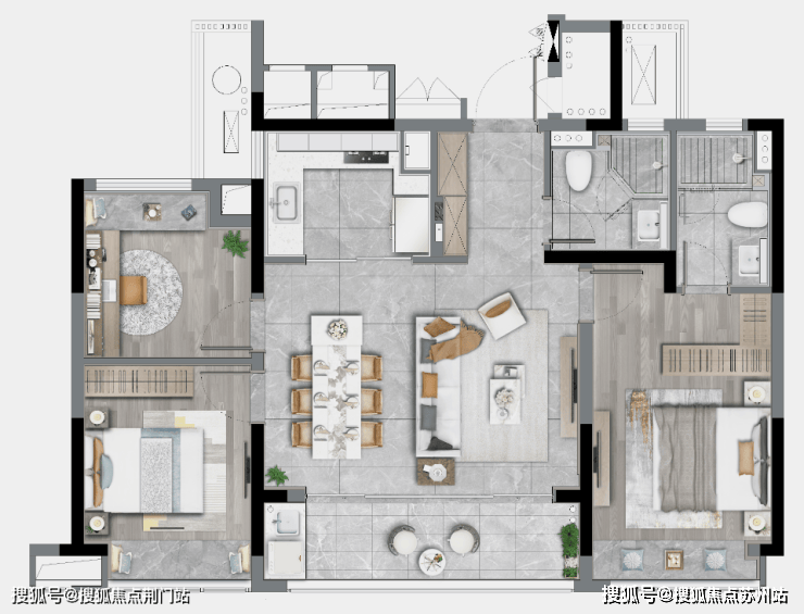 LDBK一体化的公区,充分实现了家庭成员间的互动;除了边厅外接的阳台外,南向次卧同样设计了阳台,兼顾了景观和晾晒的需求。