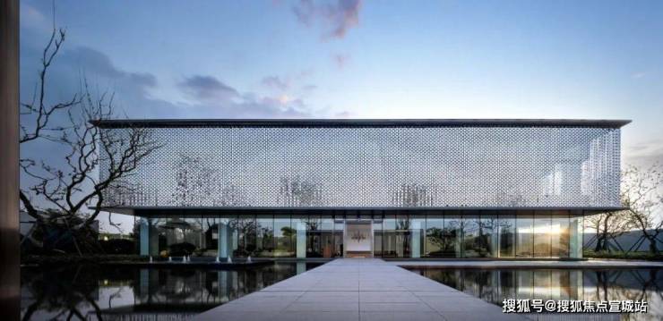 示范区主立面以银白不锈钢风动片为主,辅以珍珠白色铝板和浅灰色玻璃.徐风吹过,不锈钢片波动泛起涟漪,仿佛江南灵动的水系,勾勒出建筑独特的气质.