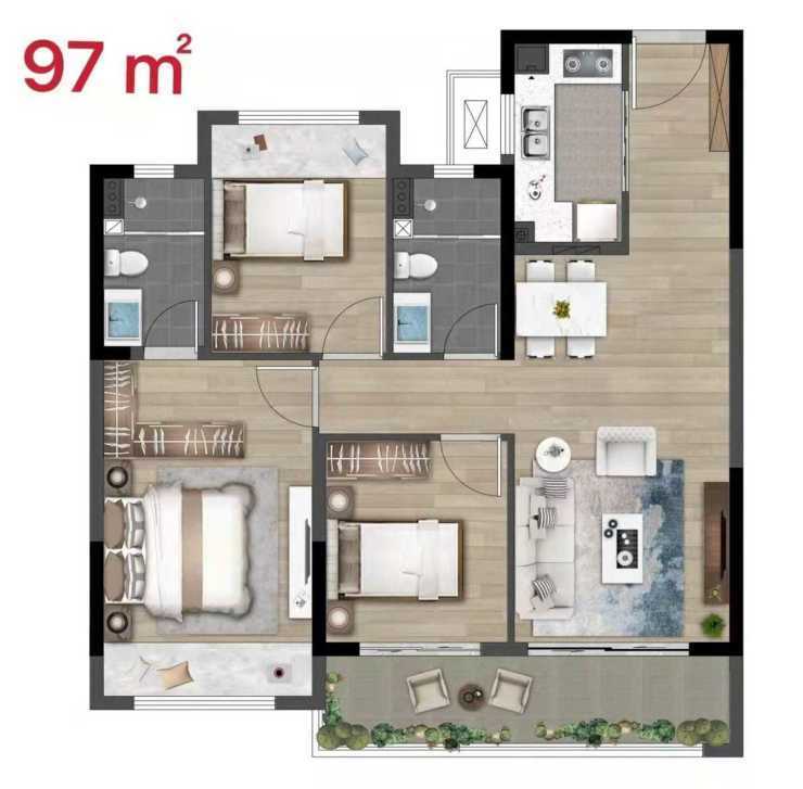 高层:75-97㎡精装三房,均价约1.1万-1.5万/㎡,总价75万起