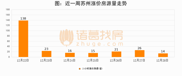 根据诸葛找房数据显示,苏州24小时涨价房源量为14套,较12月27日减少12套,环比下降46.2%。与此同时,涨价房源占比小幅回落,对于购房者来说是一个入市窗口期,购房者可抓住时机入市。