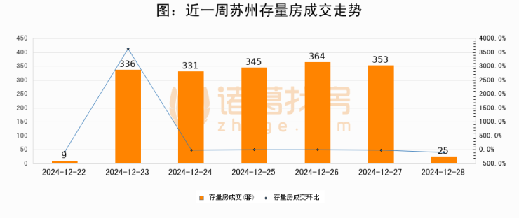 从存量房来看,2024年12月28日苏州存量房单日成交25套,比昨日减少328套,环比下降92.9%。从近一周存量房成交来看,苏州存量房日均成交套数为251套,12月28日单日成交25套,低于近一周平均水平90%。