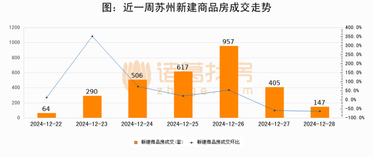 根据苏州市房地产市场和交易管理中心数据显示,2024年12月28日苏州新建商品房成交147套,较昨日减少258套,环比下降63.7%
