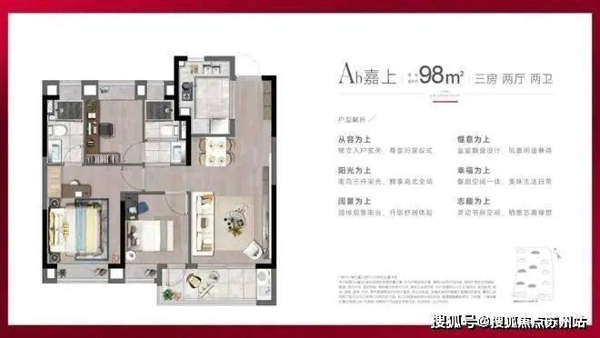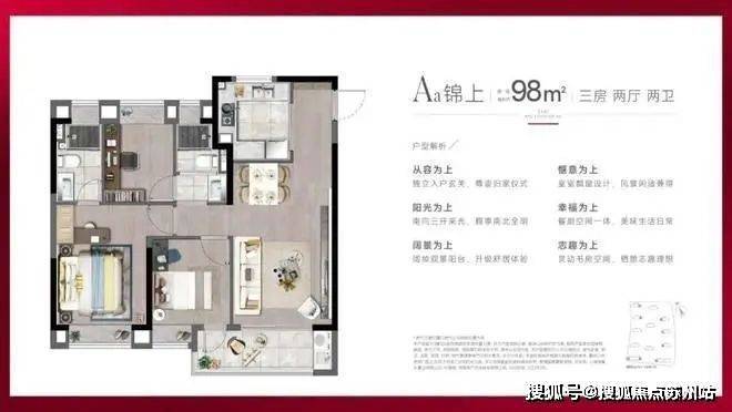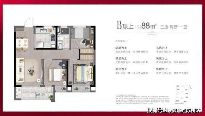 该户型在88㎡户型的基础上,将尺度进行了升级,双卫设计,三开间朝南+动静分离,室内采光面非常大,通透明亮。