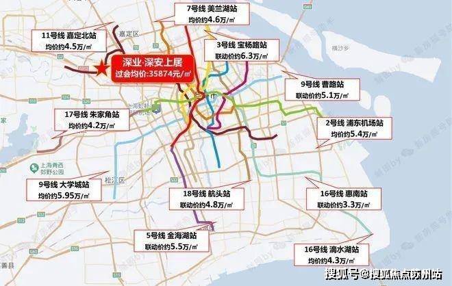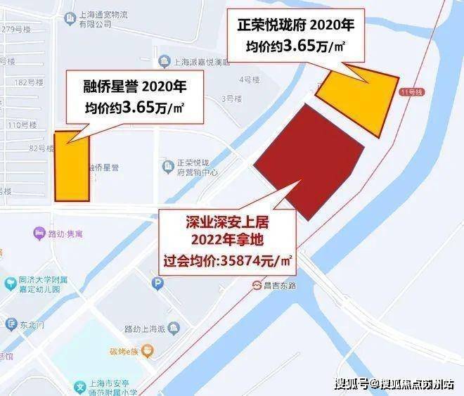 同样处于嘉定区,仅两站之隔的深业·深安上居的过会均价35874元/m²,相较于前者低了近1.5万/m²。