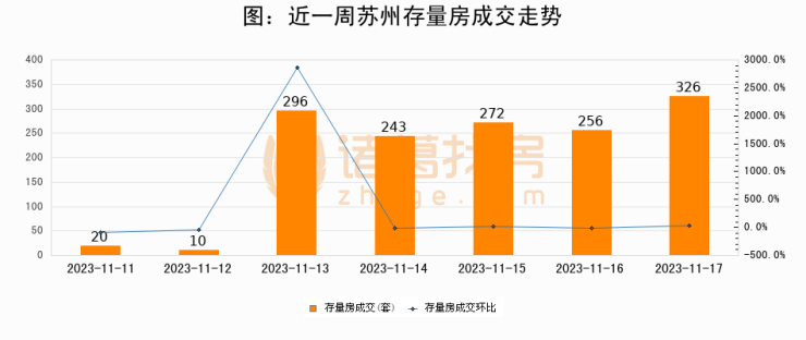 从存量房来看,2023年11月17日苏州存量房单日成交326套,比昨日增加70套,环比上涨27.3%。从近一周存量房成交来看,苏州存量房日均成交套数为203套,11月17日单日成交326套,高于近一周平均水平60.6%。