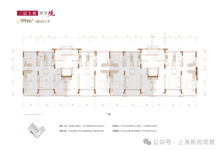 项目主打3层的超低密洋房产品,另有3套联排产品,户型类型丰富;洋房为创新的多层退台式洋房,层高高于传统常规洋房产品,3.3-3.6m层高对标别墅产品层高。