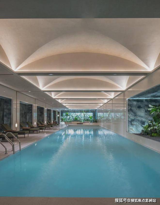 植物园泳池放在了2楼,选用了皮革面的绿色石材,营造一种树影斑驳的感觉。里面的绿植不是装饰,都是鲜活的、精心照养的。