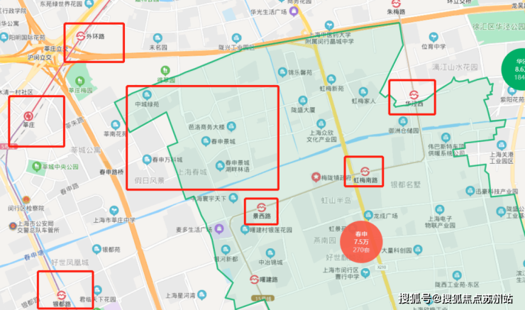 其一,春申位于外环高速外,周边距离地铁较远,几乎属于各个地铁都是擦肩而过的板块,但是春申却是四大居住示范区之一,板块内均价更是和七宝打造了全上海S20外均价最高的双子星,甚至毫不夸张,秒杀上海北面中环内大多数板块。