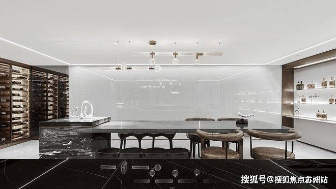 穿过岛台 另一侧是品酒室,大面积玻璃与石材细腻的纹路相结合,在起承转合间能够捕捉到,彼此细腻的纹理与形态,金属与皮质的加入加强了空间层次,沉浸酒香 闲适随性!透过视觉感官 激发内在能量,利用自然之韵,唤起人们对居住形态的迭代需求,德信浮山云湖印在沉稳中追逐未来,探索当代人居的更多可能!