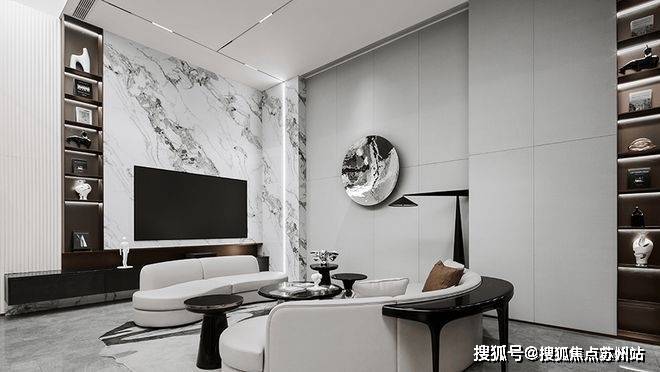 客厅在多重材质的组合下,顺畅融汇 秩序井然素雅的基调来自比例的精准把控和色彩的考究搭配,克制之间彰显出游刃有余的平衡之道!电视背景墙利用石材自身纹理,将水光潋滟的迷人景象引入室内,沙发后方的展示柜高低错落线条置于其上,玻璃和金属交融出迷濛光影!