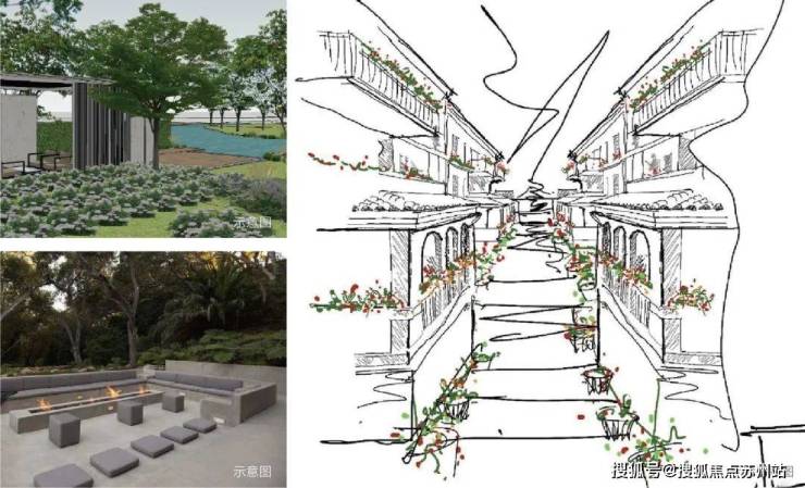 通过错落的下层空间营造出围合空间,花藤沿着铁艺爬满了廊架,搭配休息座椅,点缀艺术花艺团组,呈现静思独处的私人舒适休息空间,或邻里高朋的往来文雅,一场艺术共鸣在此发生。