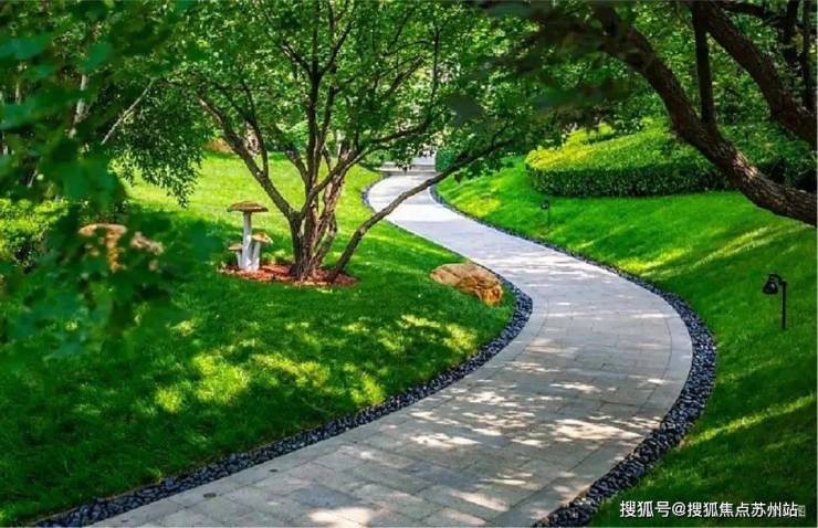 蜿蜒曲折的休闲步道,花园、平台与小品交织,合理利用地势高差,结合景观铺装,不同层次的石材与丰富的观赏花草设计的艺术美感,制造“连绵起伏”的动态艺术感,突出人文关怀和园艺感,游览之余,更有利于冥想与静思。