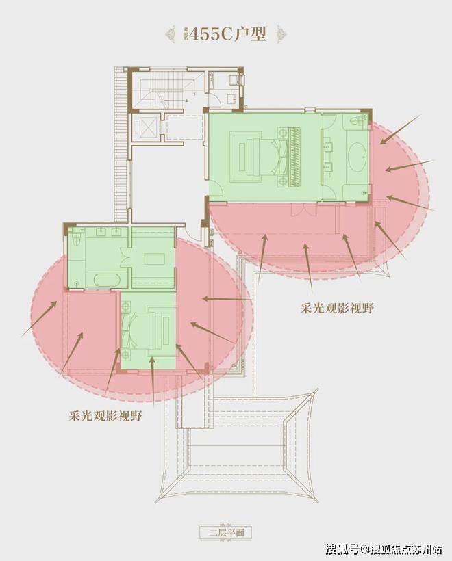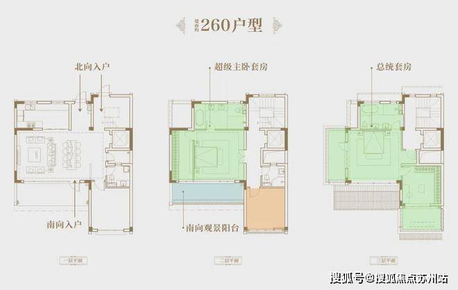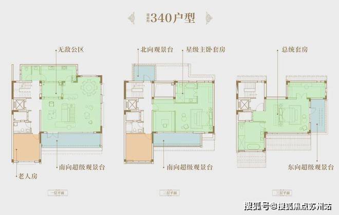 甚至,在保证二、三楼休憩区,保证了和独栋产品东侧(双拼部分户型为西侧)、南侧阳台观景的同时,还增加了北侧观景阳台,实现三面观景的无敌示意。