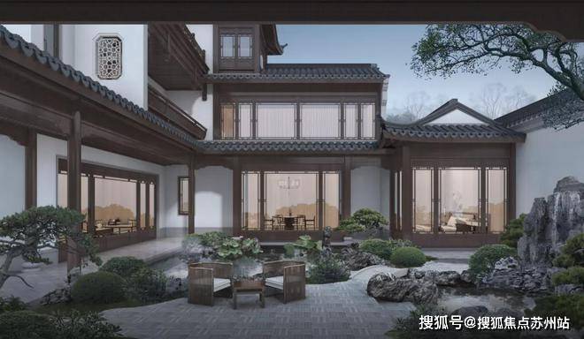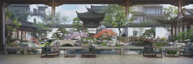 窗外的庭院内传统院落布局,假山与绿植相映成趣,桥与桥相连、石与水相倚,传承着传统苏式园林的风雅,连廊栏杆、漏窗诉说着苏州人生活中的温婉细腻、含蓄柔美。