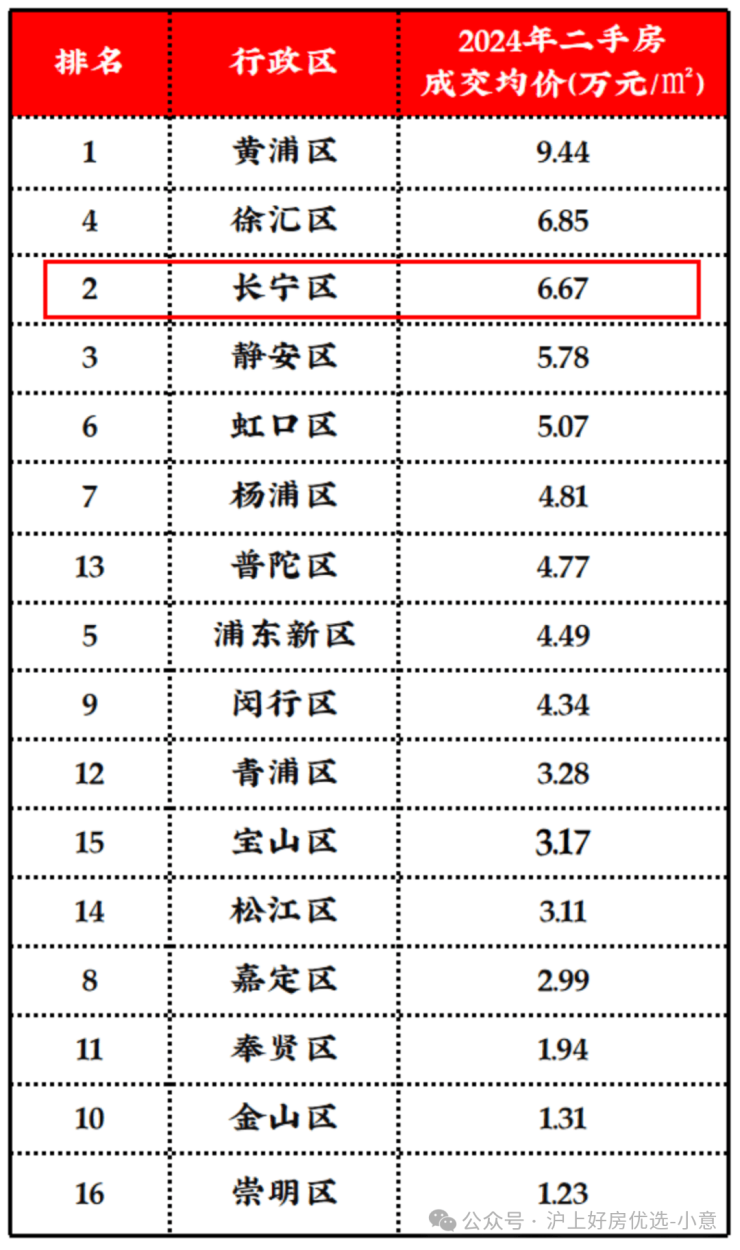 和徐汇滨江、杨浦滨江甚至是黄浦静安相比,长宁的新房供应真的是太“克制”了,所以,2024年长宁区二手成交均价(约6.67w)超过了静安(约5.78W),仅次于黄浦徐汇全市第三。
