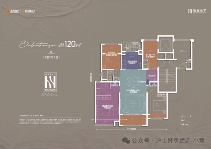 建面约120㎡户型整体采用了罕见的多阳台+贯通梯一梯一户设计!是双新政后内中环的首个!得房率也将高于双新政后同样楼层一梯一户的产品!单凭这两点,已然超前于绝大多数如今的产品!