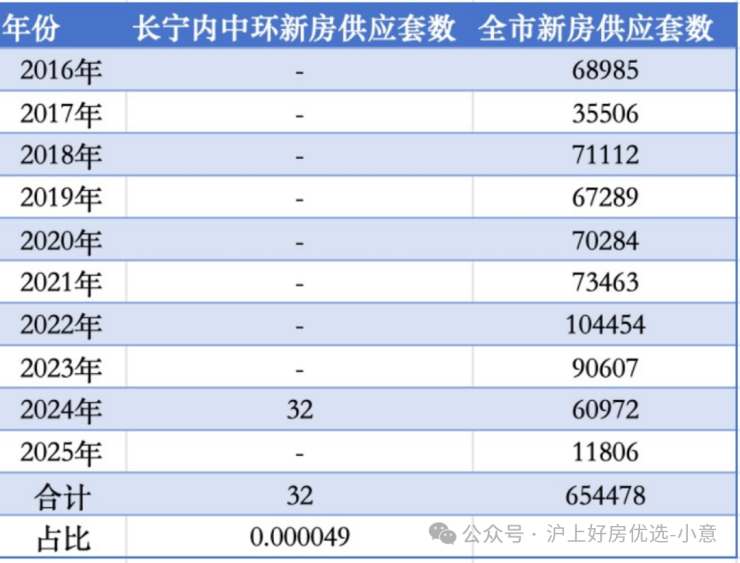 近10年(2016年至今)全上海合计入市新房65万多套,其中属于长宁内中环的只有32套,占比仅约0.000049!不到10万分之五的机会,臻稀程度简直爆表!