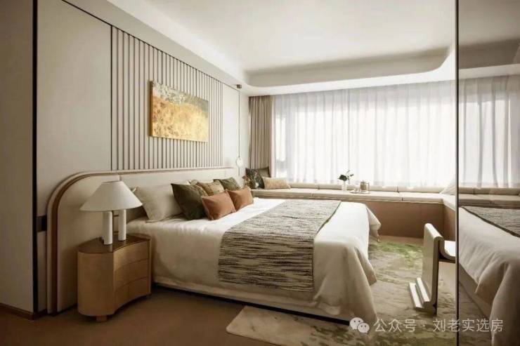 主卧套房设计,尺度惊人,贯穿南北,预留步入式衣帽间的空间,配备270°转角飘窗,实现无界视野和优异采光,大宅气度油然而生!