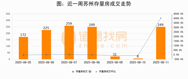 从存量房来看,2025年08月11日苏州存量房单日成交249套,比昨日增加243套,环比上涨4050%。从近一周存量房成交来看,苏州存量房日均成交套数为168套,08月11日单日成交249套,高于近一周平均水平48.2%。