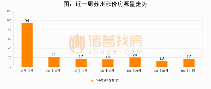 根据诸葛找房数据显示,苏州24小时涨价房源量为17套,较08月10日增加4套,环比上涨30.8%。与此同时,涨价房源占比小幅扩大,业主信心有所提升。