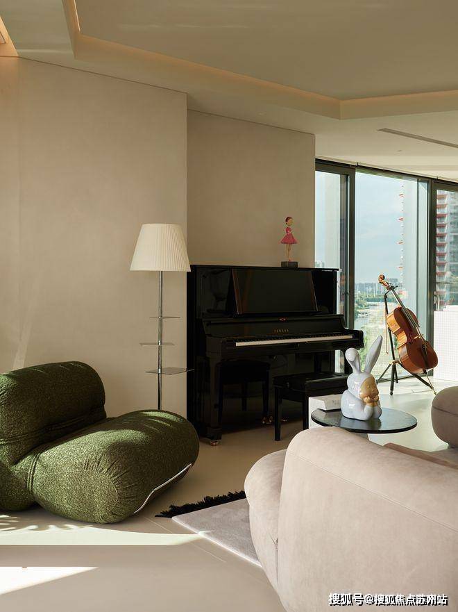 峰度天下售楼处电话:400-8123-664客厅的组合简单却又唯美,一台B&O的电视,一部钢琴,还有一套女业主喜欢的BAXTER沙发。
