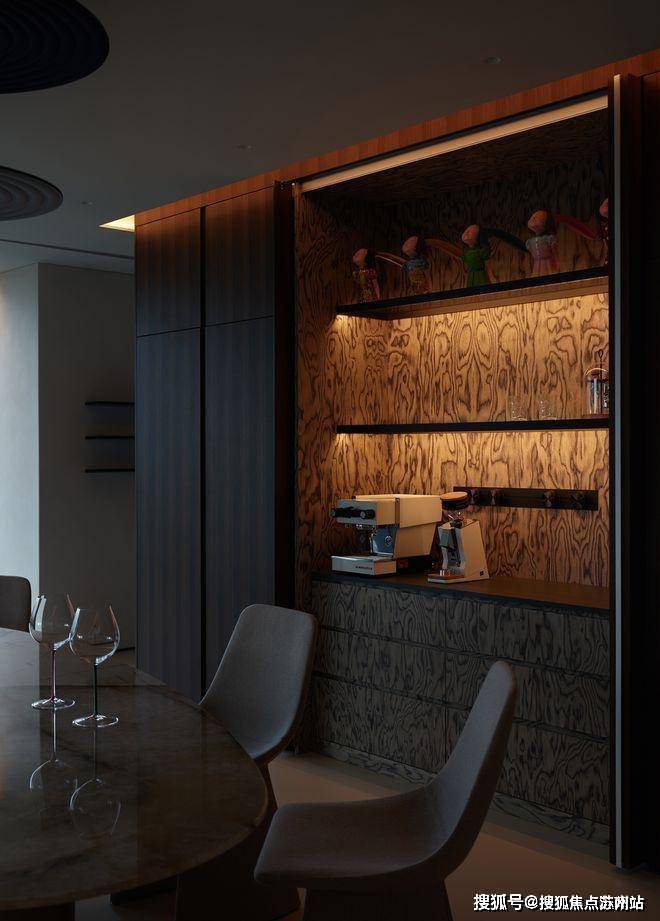 峰度天下售楼处电话:400-8123-664OOMOO木作制作的融合柜像一个装置艺术,居于主通道、客餐厅和厨房的中间,不仅是餐边柜和电器柜的组合,还起到空间分隔的作用,形成公共区域的回字动线。