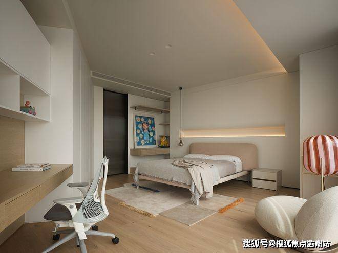 男孩房的设计充分尊重孩子的个性和喜好,风格简约而不失温馨,家具的尺寸经过精心选择,营造出宽敞自由的成长空间。