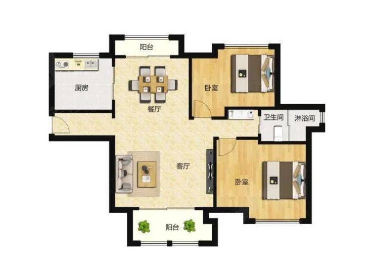 二层为大面宽客厅+南北两间独立套房;