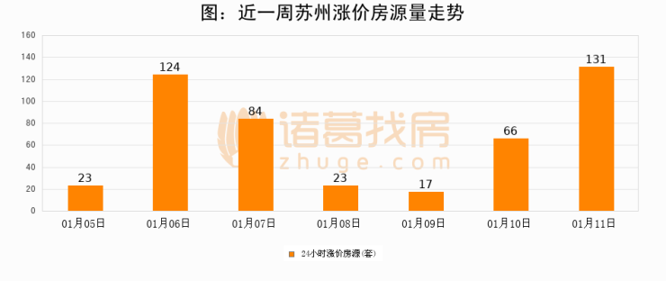 根据诸葛找房数据显示,苏州24小时涨价房源量为131套,较01月10日增加65套,环比上涨98.5%。与此同时,涨价房源占比小幅扩大,业主信心有所提升。