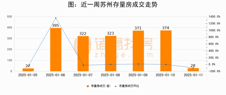 从存量房来看,2025年01月11日苏州存量房单日成交28套,比昨日减少346套,环比下降92.5%。从近一周存量房成交来看,苏州存量房日均成交套数为262套,01月11日单日成交28套,低于近一周平均水平89.3%。