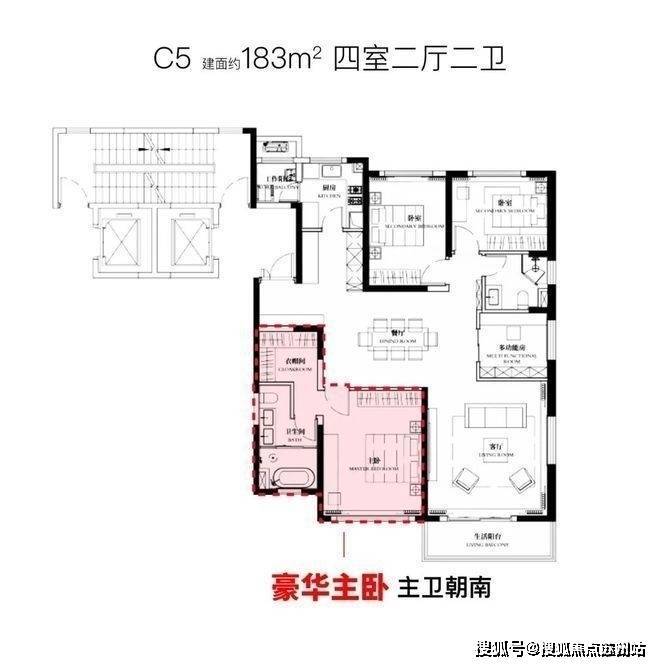 该户型主卧整体足足有约5.9米的南向开间,比客厅还要开阔.这在整个豪宅领域都是极为少见的!